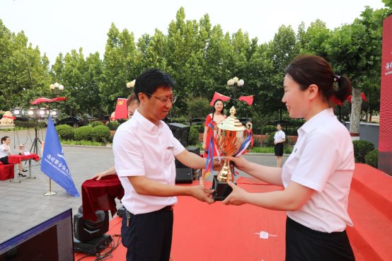 總裁桑鶴明為一等獎獲獎單位頒發冠軍大獎杯。