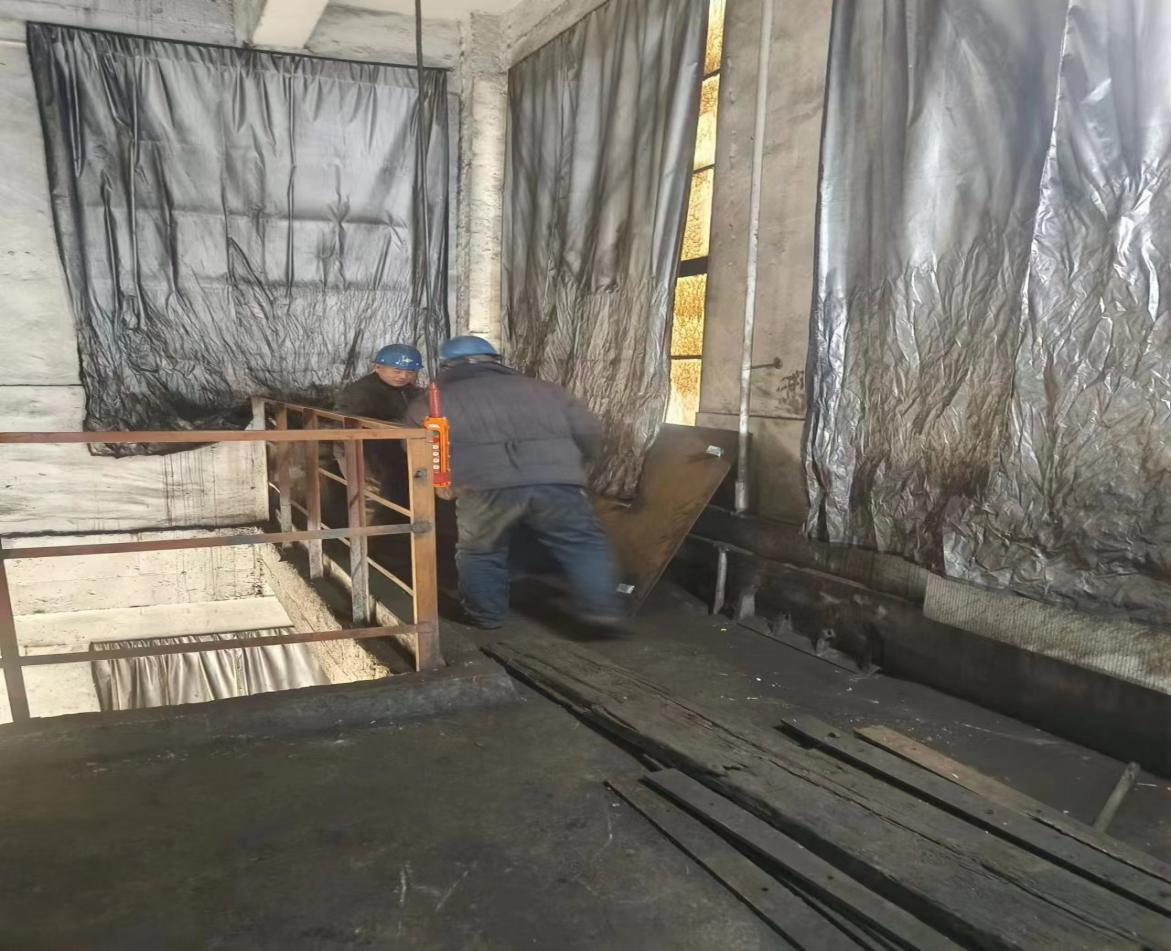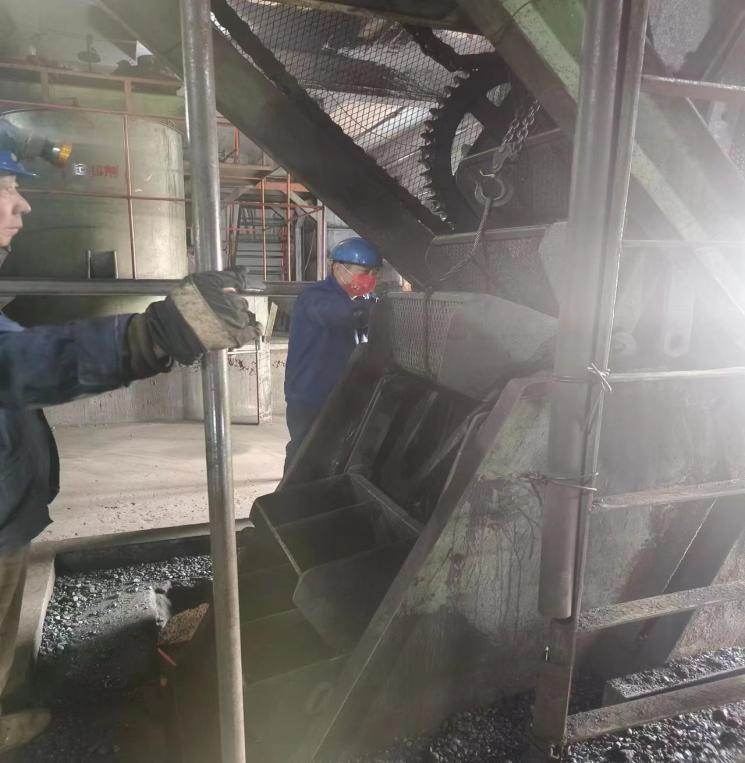 鉗工對308斗子進行更換、車間三層矸石皮帶入口處進行清理