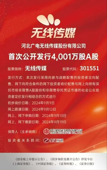 中聯(lián)項目新訊:河北廣電無線傳媒首次公開發(fā)行4001萬股A股,9月13日申購