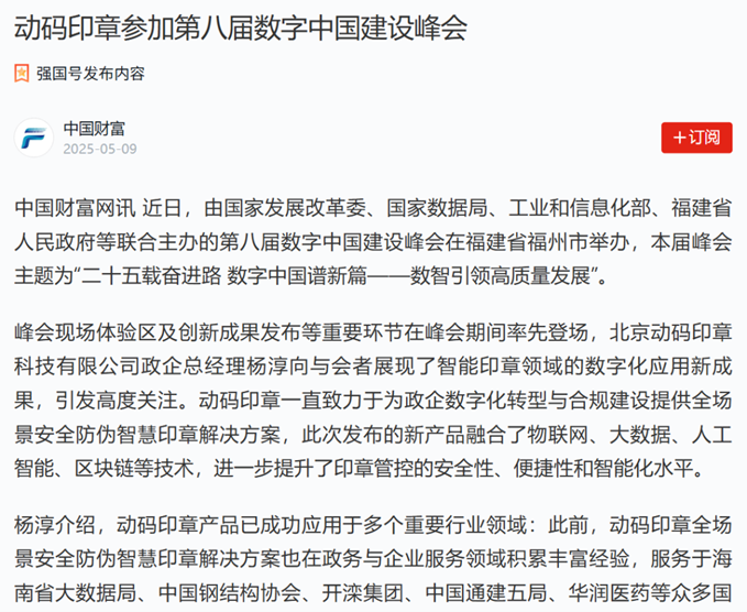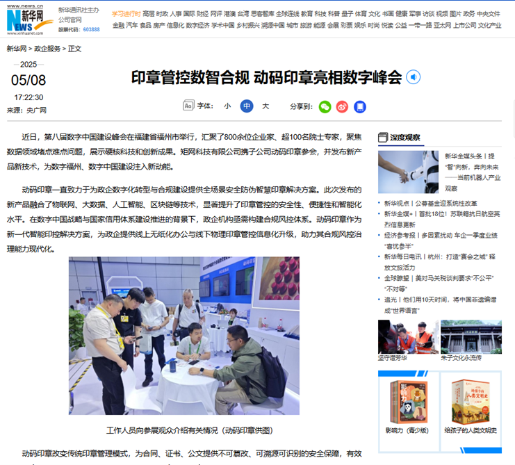 第八屆數(shù)字中國(guó)建設(shè)峰會(huì)在福建省福州市舉行,匯聚了800余位企業(yè)家、超100名院士專(zhuān)家,聚焦數(shù)據(jù)領(lǐng)域堵點(diǎn)難點(diǎn)問(wèn)題,展示硬核科技和創(chuàng)新成果。矩網(wǎng)科技有限公司攜子公司動(dòng)碼印章參會(huì),并發(fā)布新產(chǎn)品新技術(shù),為數(shù)字福州、數(shù)字中國(guó)建設(shè)注入新動(dòng)能。動(dòng)碼印章獲新華網(wǎng)、央廣網(wǎng)、學(xué)習(xí)強(qiáng)國(guó)平臺(tái)、人民政協(xié)網(wǎng)等多家媒體及中國(guó)防偽行業(yè)協(xié)會(huì)、中國(guó)安防協(xié)會(huì)、河南省數(shù)字經(jīng)濟(jì)產(chǎn)業(yè)協(xié)會(huì)公眾號(hào)關(guān)注報(bào)道。