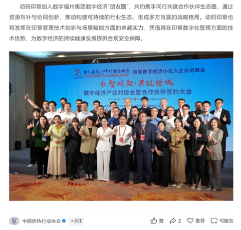 動(dòng)碼印章作為專(zhuān)業(yè)的全場(chǎng)景安全防偽智慧印章解決方案提供商,加入數(shù)字福州集團(tuán)數(shù)字經(jīng)濟(jì)“朋友圈”,共約攜手同行共建合作伙伴生態(tài)圈,通過(guò)資源互補(bǔ)與協(xié)同創(chuàng)新,推動(dòng)構(gòu)建可持續(xù)的行業(yè)生態(tài),形成多方互贏的戰(zhàn)略格局。動(dòng)碼印章也將發(fā)揮在印章管理技術(shù)創(chuàng)新與場(chǎng)景賦能方面的卓越實(shí)力,憑借其在印章數(shù)字化管理方面的技術(shù)優(yōu)勢(shì),為數(shù)字經(jīng)濟(jì)的持續(xù)健康發(fā)展提供合規(guī)安全保障。