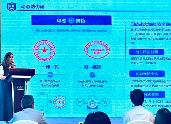 項目路演活動中,矩網(wǎng)科技大客戶經(jīng)理李蕊詳細介紹了公司技術創(chuàng)新點、應用場景,充分展現(xiàn)了企業(yè)賦能印章管理的獨特實力。矩網(wǎng)科技是一家集研發(fā)、生產(chǎn)、運營于一體的自主創(chuàng)新型科技企業(yè),被評為高新技術企業(yè)、河北省“專精特新”中小企業(yè)、信息技術應用創(chuàng)新工作委員會技術活動單位、國家知識產(chǎn)權優(yōu)勢企業(yè),目前已獲得290多項知識產(chǎn)權證書。公司團隊自主研發(fā)了具有突破性和創(chuàng)新性的物電同源一體化智慧印章解決方案“動碼印章”。動碼印章應用物聯(lián)網(wǎng)、大數(shù)據(jù)、人工智能、區(qū)塊鏈等技術徹底改變傳統(tǒng)印章模式,其三大核心產(chǎn)品動碼印章機、動態(tài)防偽碼、物電一體化印控平臺,圍繞印章管理、印跡防偽、文件簽署、認證服務、儲存服務、查驗溯源服務形成全方位的管理系統(tǒng),解決傳統(tǒng)印章管理難、易丟失、易偽造等痛點,從根源杜絕假章風險與內(nèi)部違規(guī)用印隱患,提升用印便捷性與效率,實現(xiàn)用印安全與高效統(tǒng)一管理。路演現(xiàn)場,動碼印章創(chuàng)新技術理念、成功應用案例以及市場潛力,引發(fā)在場投資機構、金融機構和企業(yè)代表的濃厚興趣與關注認可,眾多參會者主動與動碼印章團隊深入溝通。
