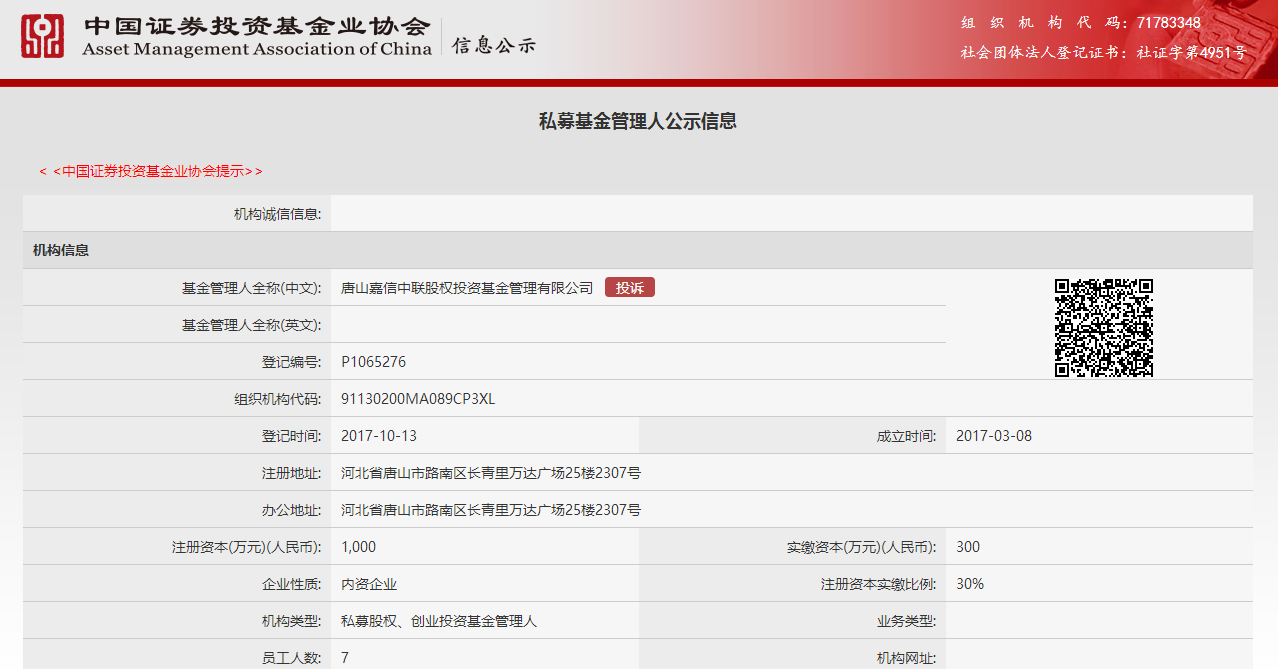 唐山嘉信中聯(lián)股權(quán)投資基金管理有限公司(以下簡稱“嘉信中聯(lián)公司”)是由海明聯(lián)合能源集團(tuán)中聯(lián)投資管理有限公司全資控股,專門從事股權(quán)類投資基金管理的公司,于2017年10月13日私募基金管理人牌照,登記編號:P1065276。