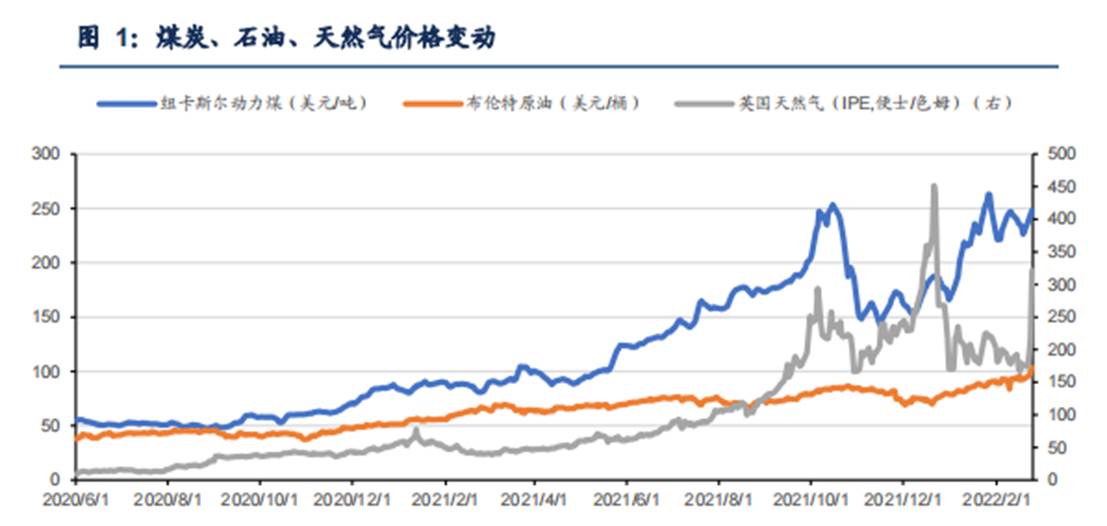 目前受俄烏沖突擾動,能源預期供給減少,價格上漲劇烈。2月24日,布倫特原油價格自2014年后首次突破100美元/桶,英國天然氣期貨價格連續三日上漲,單日最大漲幅達50.34%。紐卡斯爾動力煤現貨價達248.35美元/噸,比去年末上漲近50%。