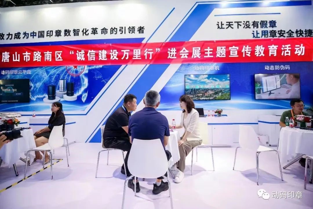 展會期間,動碼印章展位舉辦了唐山市路南區“誠信建設萬里行”進會展主題宣傳教育活動,路南區委副書記、區長張靜蒞臨展位,在甘戈總經理的介紹下,詳細了解了動碼印章在助力政企數智化轉型、構建社會誠信體系等方面的顛覆性創新,并對動碼印章日后的發展寄予厚望。