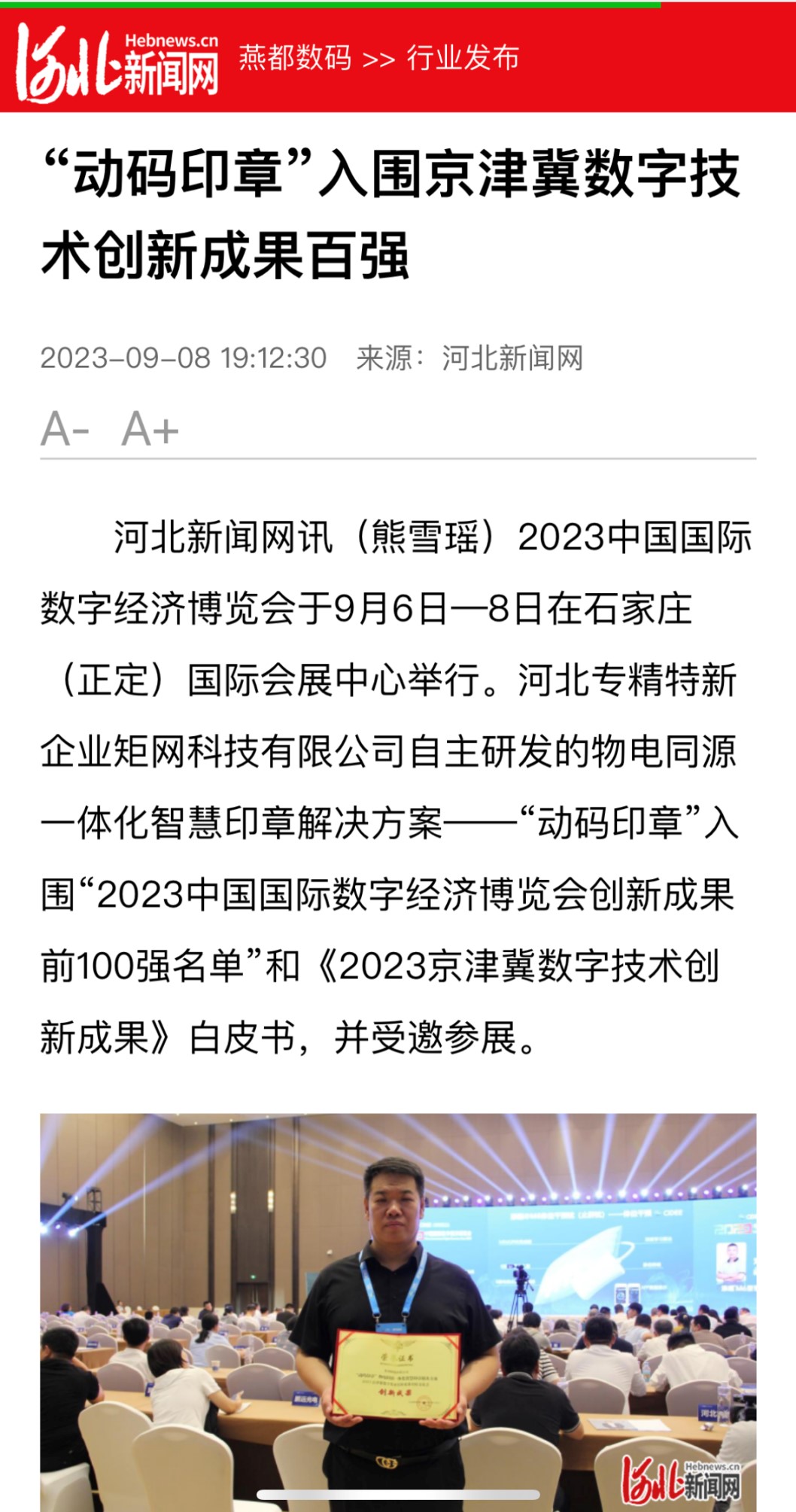 河北專精特新企業矩網科技有限公司自主研發的物電同源一體化智慧印章解決方案“動碼印章”,在上千家申報企業中脫穎而出,成功入圍“2023中國國際數字經濟博覽會創新成果前100強名單”和《2023京津冀數字技術創新成果》白皮書,矩網科技有限公司總經理、“動碼印章”項目負責人甘戈應邀在9月8日的新一代信息技術創新產品發布會上發表了《動碼印章 中國數字化革命顛覆者》主題演講,反響熱烈。
