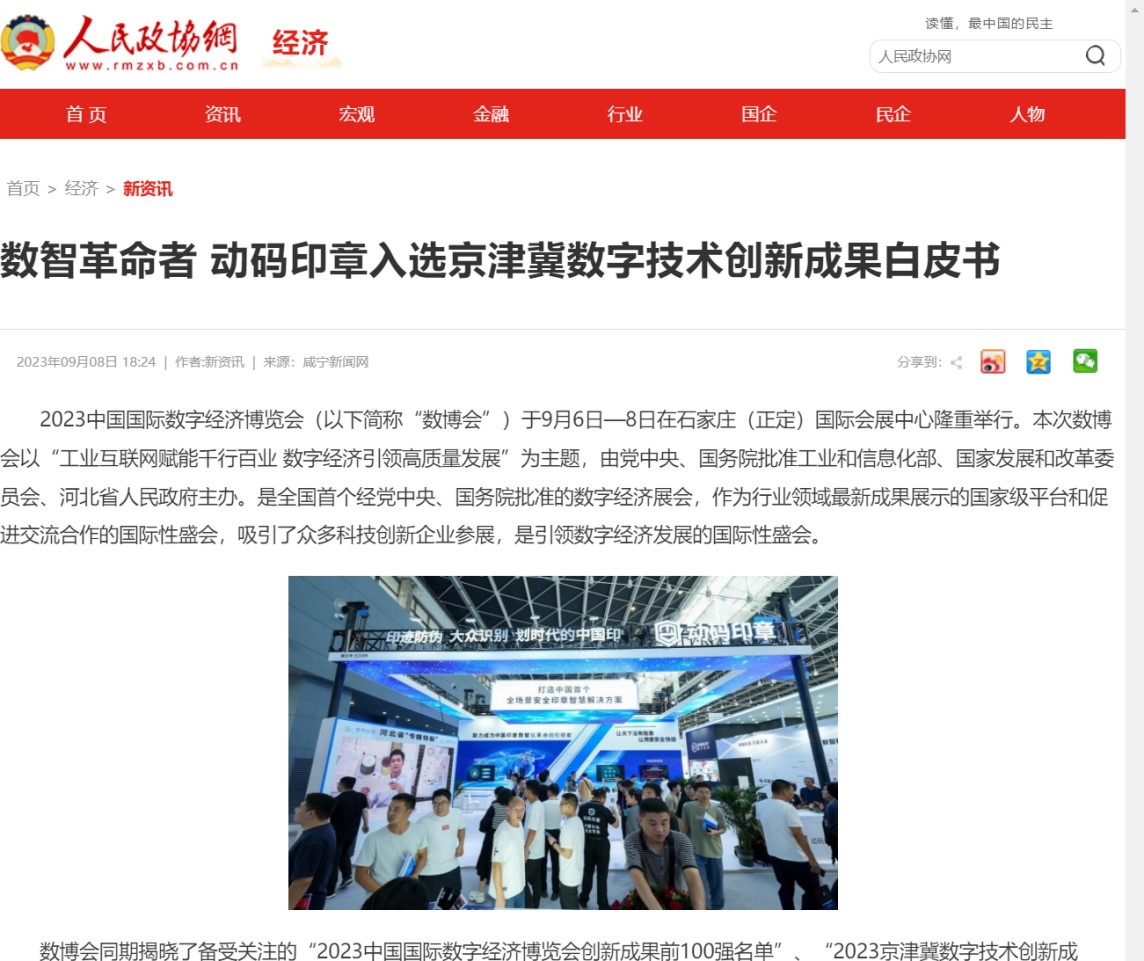 “2023中國國際數字經濟博覽會創新成果前100強名單”及《2023京津冀數字技術創新成果》白皮書。矩網科技有限公司自主研發的“動碼印章”成功入圍百強名單和白皮書。