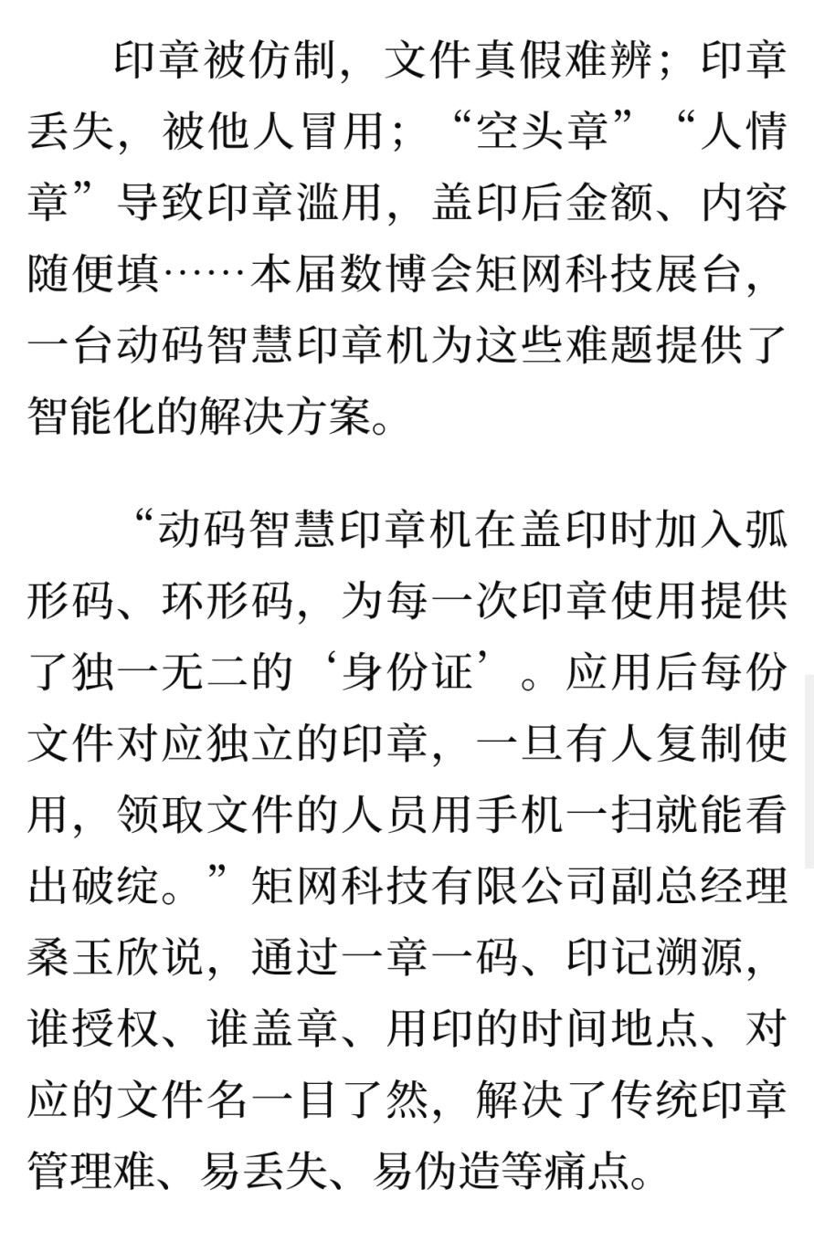 新華社、河北新聞網、1012交通廣播、1012在路上、中國商報、河北工人報、香港商報、河青新聞網、燕趙新聞網等多家新聞媒體相繼來到展位進行采訪報道,稱動碼印章在解決傳統印章存在的易偽造、印跡無法防偽、大眾無法鑒別真假等問題,具有重要的創新意義及廣闊的應用前景;為促進河北工業互聯網創新發展,推動工業化和信息化深度融合提供了新思路。